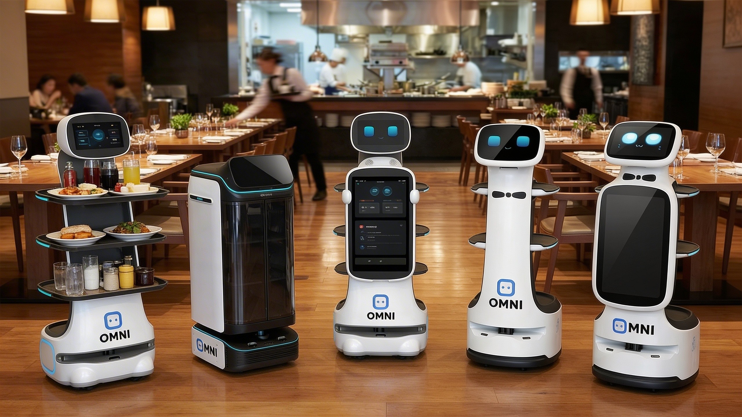 A customer-facing service robot featuring expressive head movement and interactive engagement, enhancing the guest experience while autonomously delivering items.